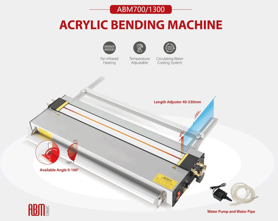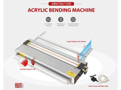 AECFUN ABM700 je kompaktan ručni stroj za savijanje akrilnih (plexiglas) i sličnih termoplastičnih ploča koji omogućuje preciznu termičku obradu i savijanje materijala širine do 650 mm te debljine od 1 do 10 mm. Stroj je posebno pogodan za izradu izloga, natpisa, dekorativnih elemenata i workshop-radionica.